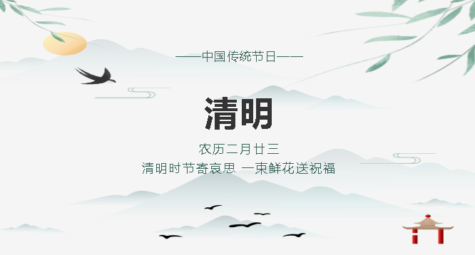 又是一年清明際,又是追思紀(jì)念時(shí)。清明節(jié)是中國(guó)的傳統(tǒng)節(jié)日之一,它不僅是人們祭奠祖先、緬懷先烈的節(jié)日,也是中華民族認(rèn)祖歸宗的紐帶。華榮華全體員工祝大家萬(wàn)事順意,平安健康!關(guān)于2021年“清明節(jié)”放假時(shí)間,我司作出以下安排: