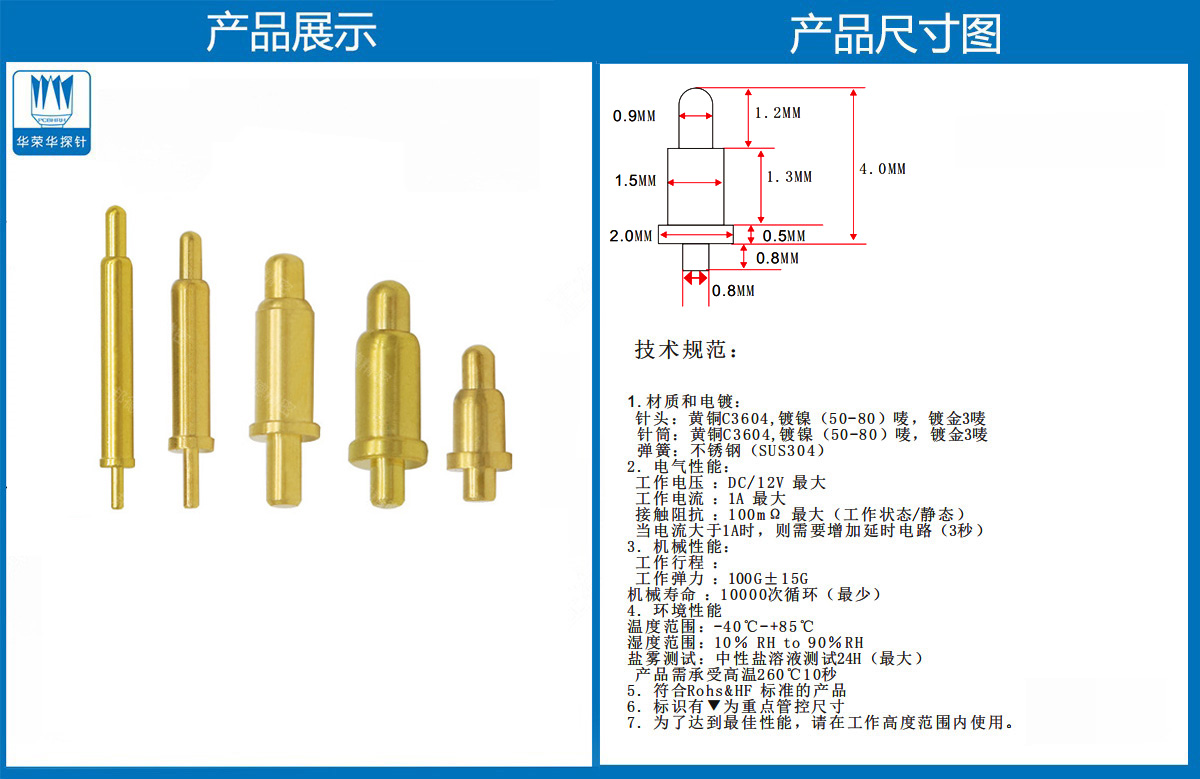 產(chǎn)品介紹:這個(gè)針通常用于智能手表,藍(lán)牙耳機(jī)上的有充電的功能,但是探針總體來(lái)說(shuō)還是測(cè)試的