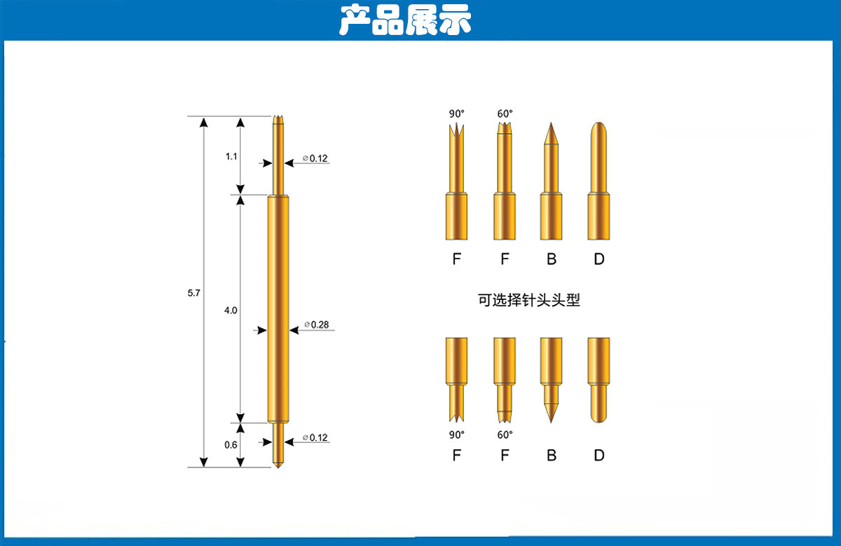 產(chǎn)品頭型:探針外徑為0.28mm,總長度為5.7mm、針的兩端的頭型分為尖頭