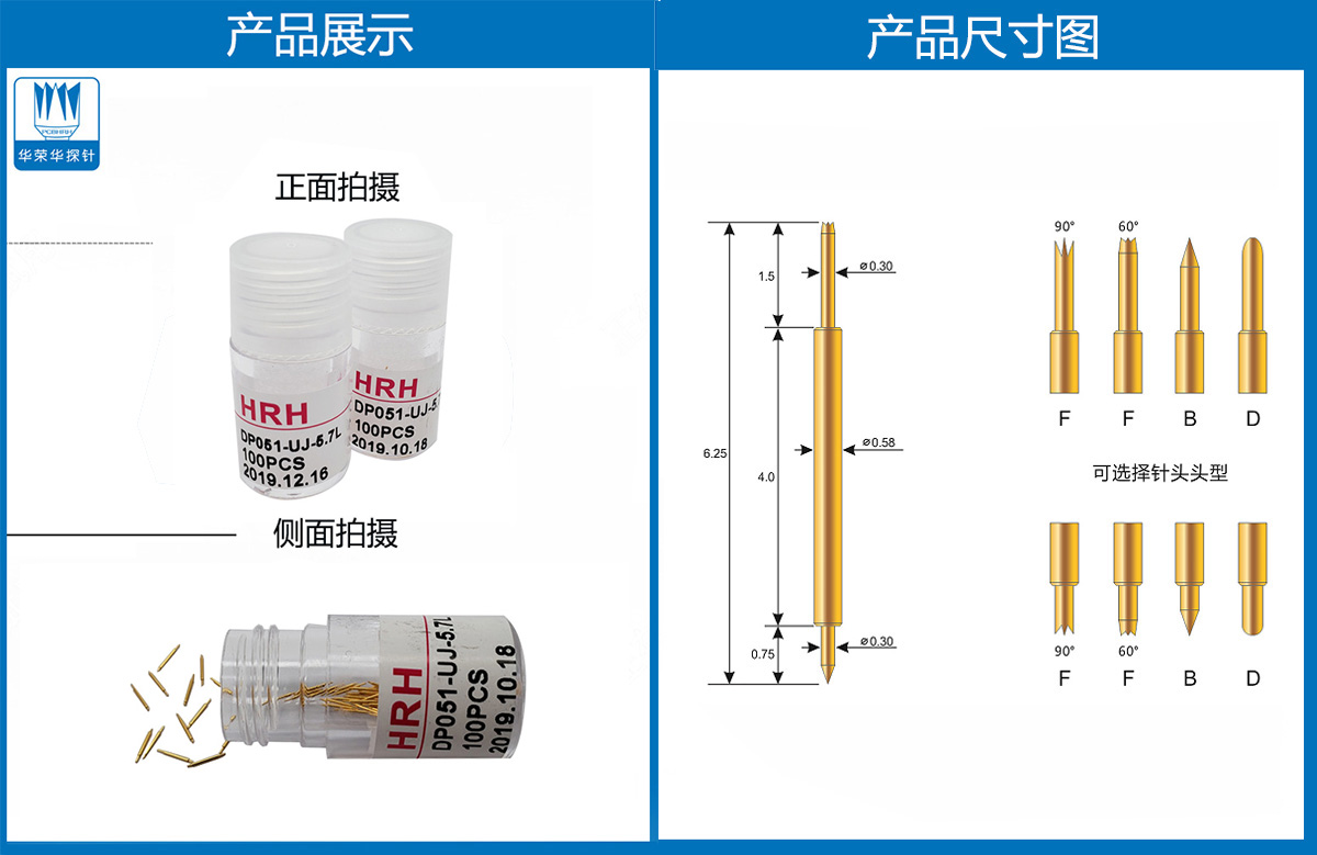 產(chǎn)品介紹:探針外徑為0.51mm,總長(zhǎng)度為5.7mm、針的兩端的頭型為爪頭,圓頭