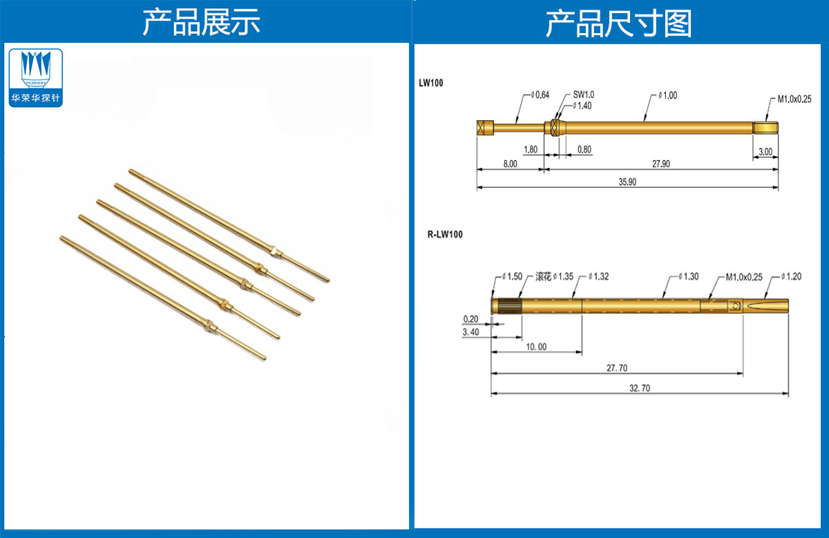 產(chǎn)品簡介:LW100線束探針、1.0mm測試針、總長35.90mm、彈簧針、頂針、探針